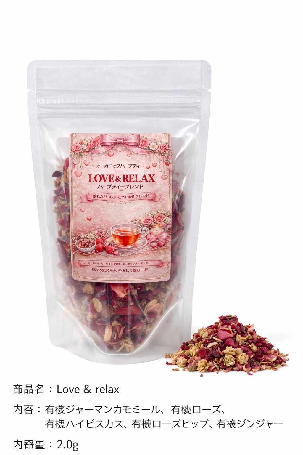 Love & relax は、有機ジャーマンカモミールとローズをベースに、ハイビスカス、ローズヒップ、ジンジャーをブレンドした、香り豊かで飲みやすいハーブティーです。